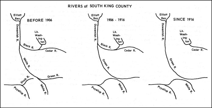 The intro to the 1950s Superman television show claimed, “He can change the course of mighty rivers.” So it was with early settlers and the rivers of South King County. This illustration charts three major changes that established the area’s current hydrology. The first alteration came as a result of river wars between farmers in King and Pierce counties. In the era before dams modulated river flows, the Kent Valley was subject to frequent floods by the combined forces of the White and Green Rivers. The floods caused significant damage to the growing settlements of Kent and Auburn, where the two rivers merged. King County residents first diverted the White to flow toward Puyallup, but the Pierce County faction blasted a formidable bluff to move the river’s course back to the north. A massive flood in 1906 again sent the White River into the Stuck River and ultimately the Puyallup. Lawsuits were filed and levees were built, but new channel dredging and a settlement agreement sealed White River’s fate. It would henceforth flow to Tacoma.