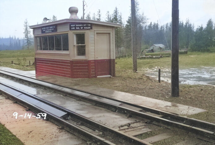 Car weighing at Kanaskat was discontinued by N.P. in 1961. In 1967, the unused scale house was purchased by an employee, Dave Sprau, who provided much of the railroad information for this and previous columns. The purchase price was $20. It was skidded to the site of his mobile home about 300 feet distant and used for storage. That site, sans mobile home, can be seen near the trees at the far right of this Sept. 14, 1959, King County Assessor photo. In 1971, Sprau built a home on Sugarloaf Mountain near Kangley and moved there, “scale house and all.”