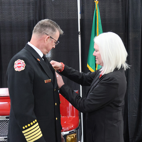 Puget Sound Fire promote to Fire Chief on Friday, January 2, 2026. During the ceremony, Chief Jones took his oath of office, given by Puget Sound Regional Fire Authority Governance Board Chair Toni Troutner, and then he had his badge pinned on by his wife. The Fire Chief of Puget Sound Fire provides overall leadership, strategic direction, and executive management for the organization while ensuring high-quality emer-gency services, fiscal stewardship, and compliance with all legal and governance requirements. The Chief also serves as the primary advisor to the Governance Board and is responsible for organizational culture, community trust, and the development and wellbeing of all members.