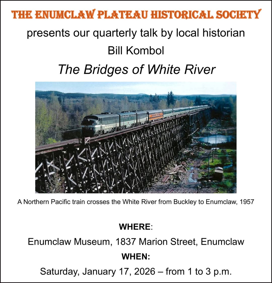 Please join us at the Enumclaw Museum this Saturday from 1 to 3 pm for Bill Kombol’s presentation, “The Bridges of White River.”