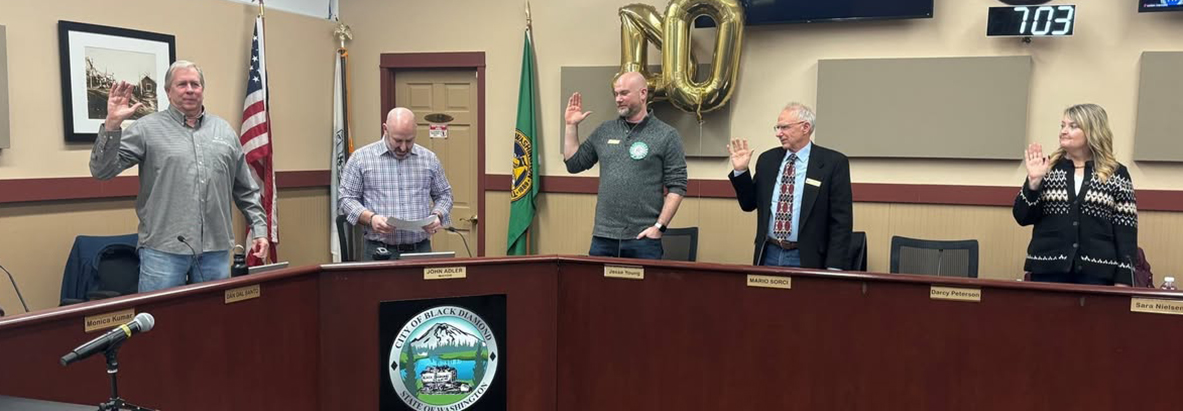 During the January 8th special meeting of the Black Diamond City Council, newly elected Mayor John Adler, along with three returning Councilmembers and two newly elected Councilmembers, were sworn into office. At the same meeting, Councilmember Deady was elected to serve as Mayor Pro Tem for 2026. City of Black Diamond Photo.